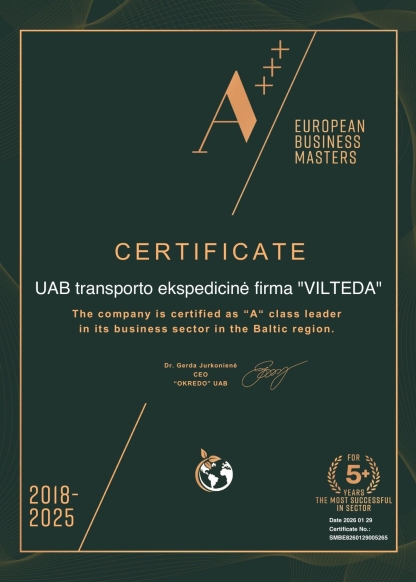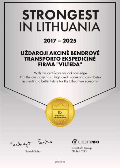 2016 m. - UAB TEF "VILTEDA" pripažinta Geriausia 2016 m. Lietuvos nacionalinės ekspeditorių ir logistų asociacijos LINEKA įmone.