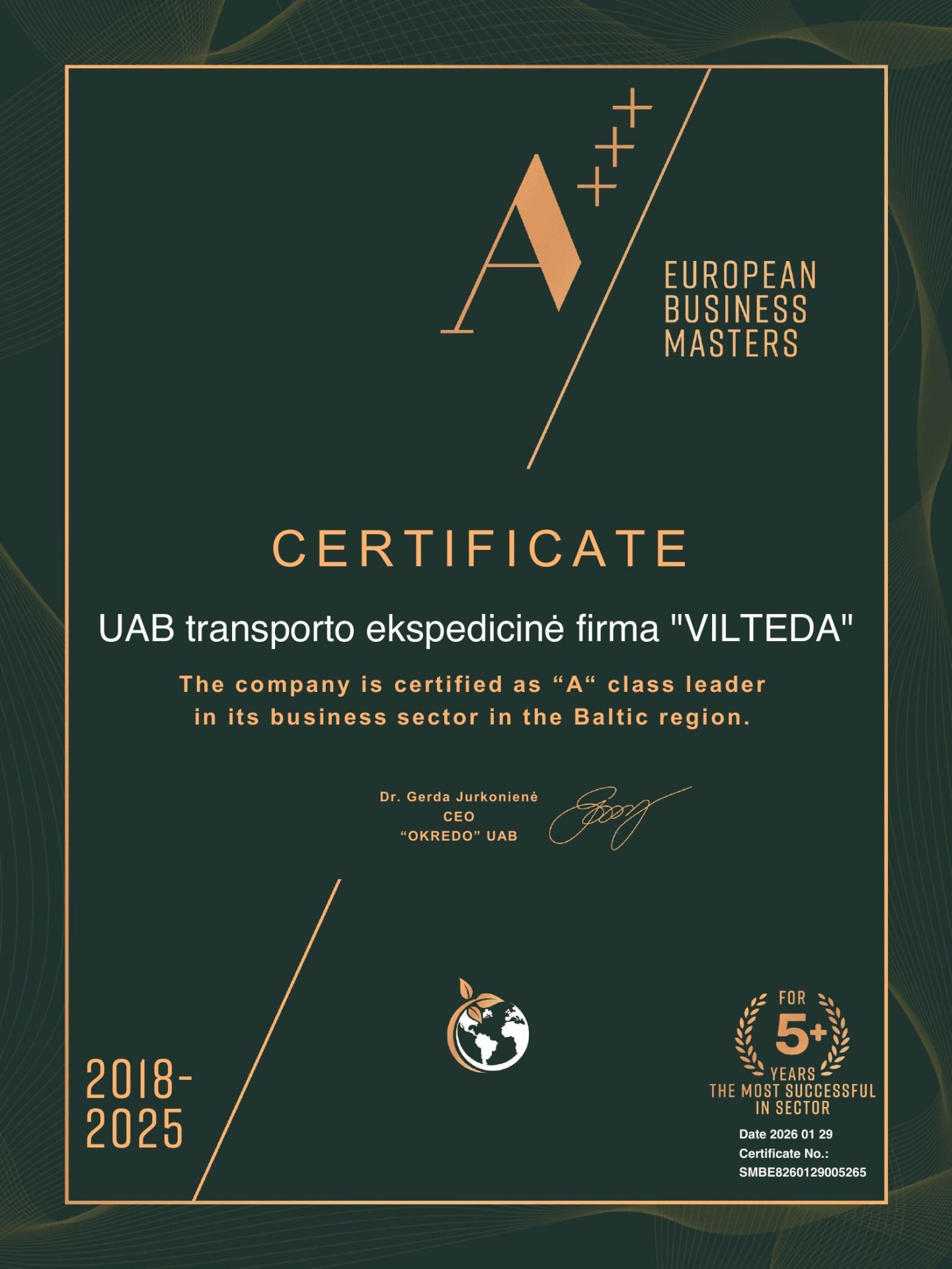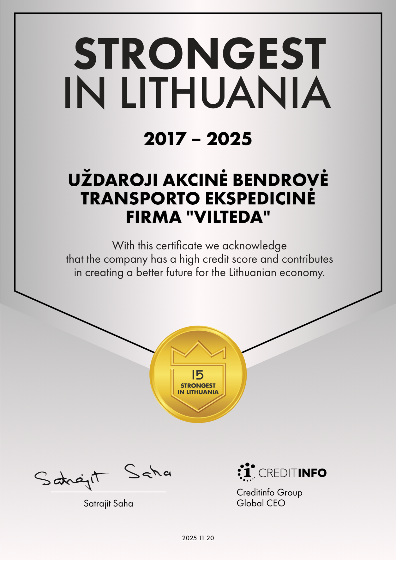 2016 г. - Литовская национальная ассоциация экспедиторов и логистов „LINEKA“ признала ЗАО ТЭФ „VILTEDA“ одной из лучших компаний 2016 года.